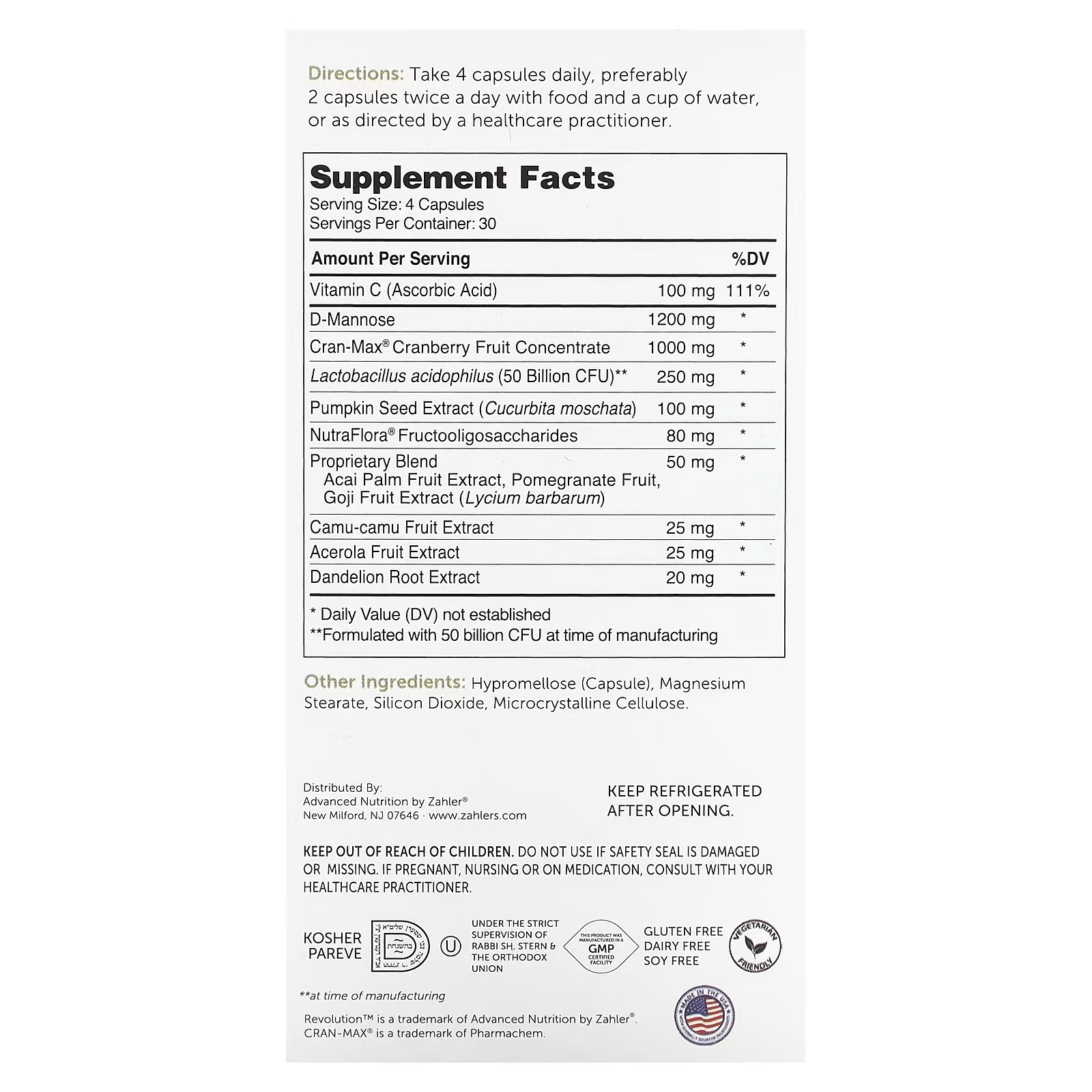 Revolution™ contains a powerful blend of natural ingredients such as our proprietary blend of superfruits, D-Mannose, cranberries, prebiotics and probiotics, to support a healthy urinary tract.