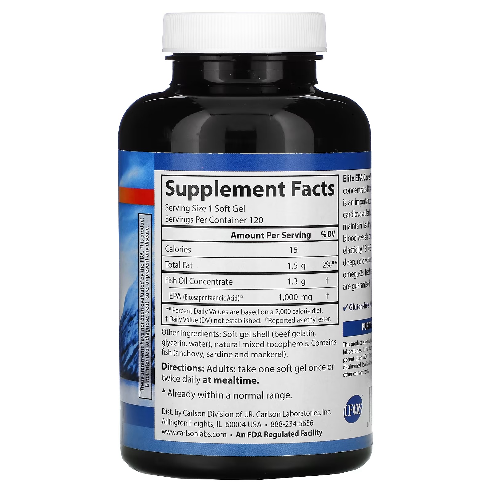Elite EPA Gems® provides 1,000 mg of concentrated EPA in a single soft gel. EPA is an important omega-3 that supports cardiovascular function by helping to maintain healthy normal triglyceride levels, blood vessels, circulation, and arterial wall elasticity. Elite EPA Gems is sourced from deep, cold water fish, and like all Carlson omega-3s, freshness, potency, and purity are guaranteed.