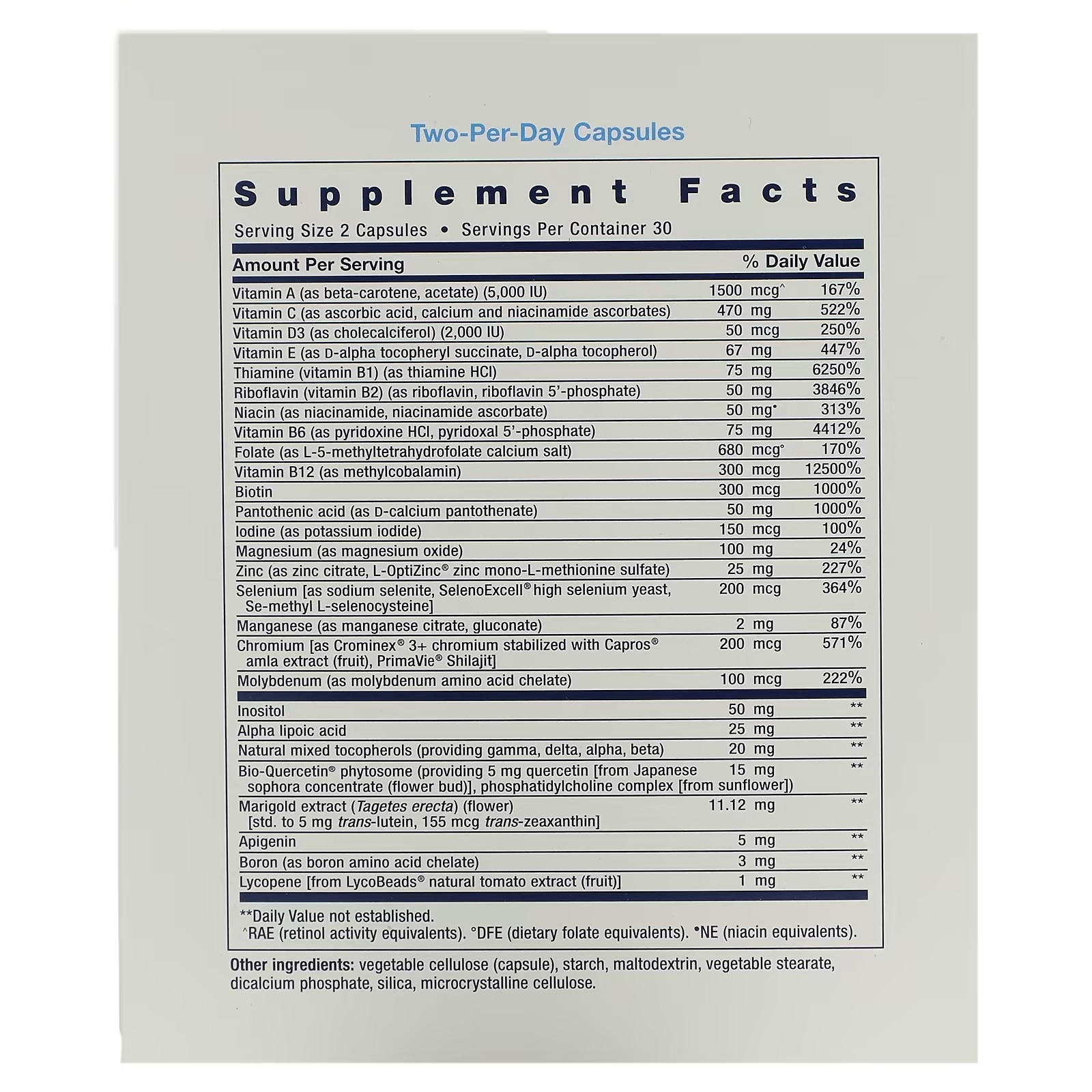 Two-Per-Day Capsules This formula gives you a broad spectrum of the essential vitamins, minerals and other nutrients the body needs. Many multivitamins give you only the average daily dose of vitamins and minerals. Our Two-Per-Day formula beats Centrum® Silver® Adults 50+ in 10 ways, including more of vitamins B1, B3, B6, B12, C, D & E; biotin; selenium; and zinc.