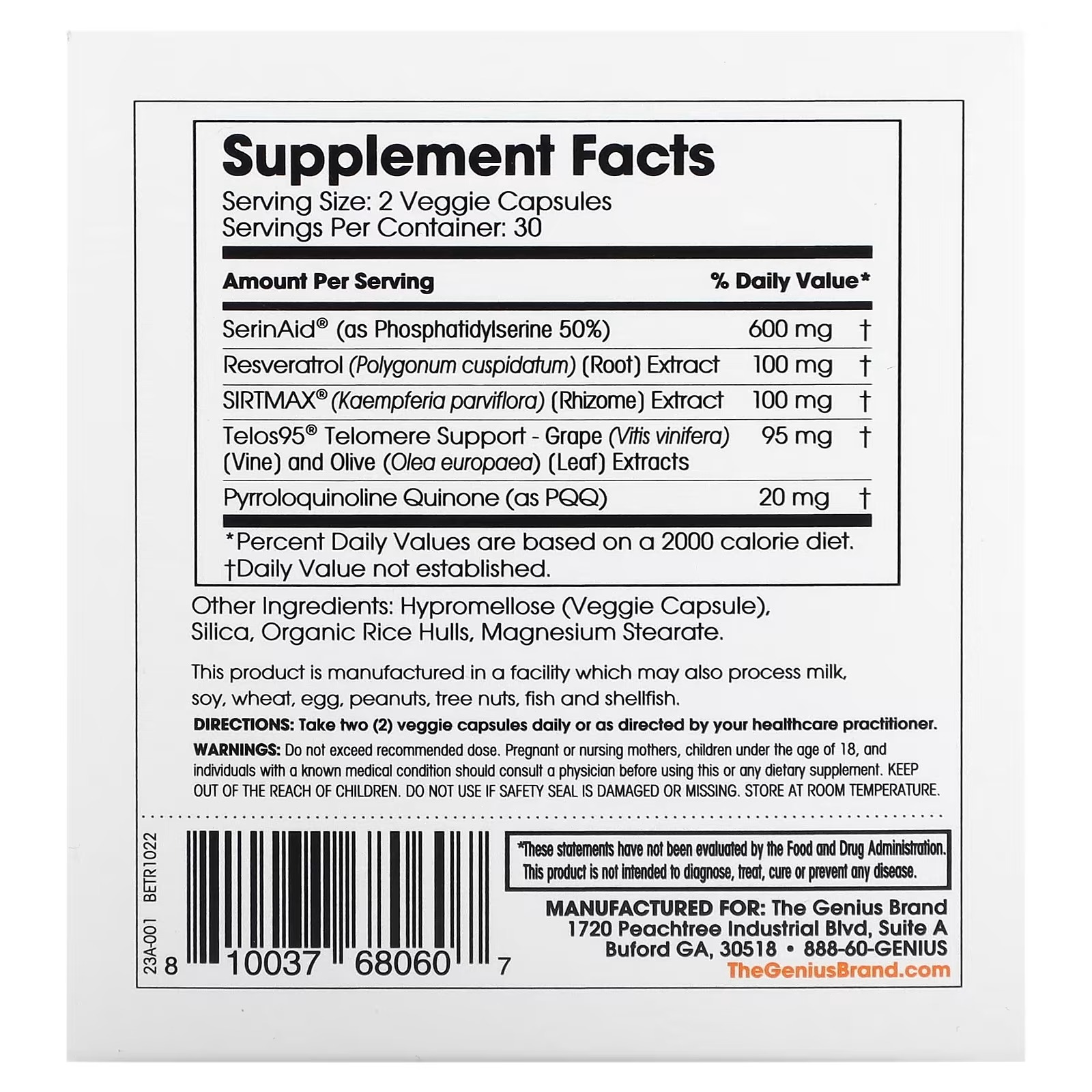 Inside each of our cells are literal biological clocks called telomeres that assist with healthy cell replication. These telomeres grow shorter with time due to damage from free radicals, stress, and environmental toxins. Genius Eternal contains Telos95®, shown In clinical trials to help extend telomere length and lower cellular age. In addition, Genius Eternal includes SerinAid® and NMN to provide cognitive support for memory, concentration, and learning while further bolstering the body’s biochemical functions to support youthfulness and healthy aging. The human biohacking revolution is now: Unlock the Genius within yourself today!
